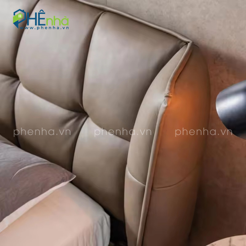 Phần đầu giường cao, được thiết kế liền khối với phần thân giường, tạo cảm giác liền mạch và sang trọng