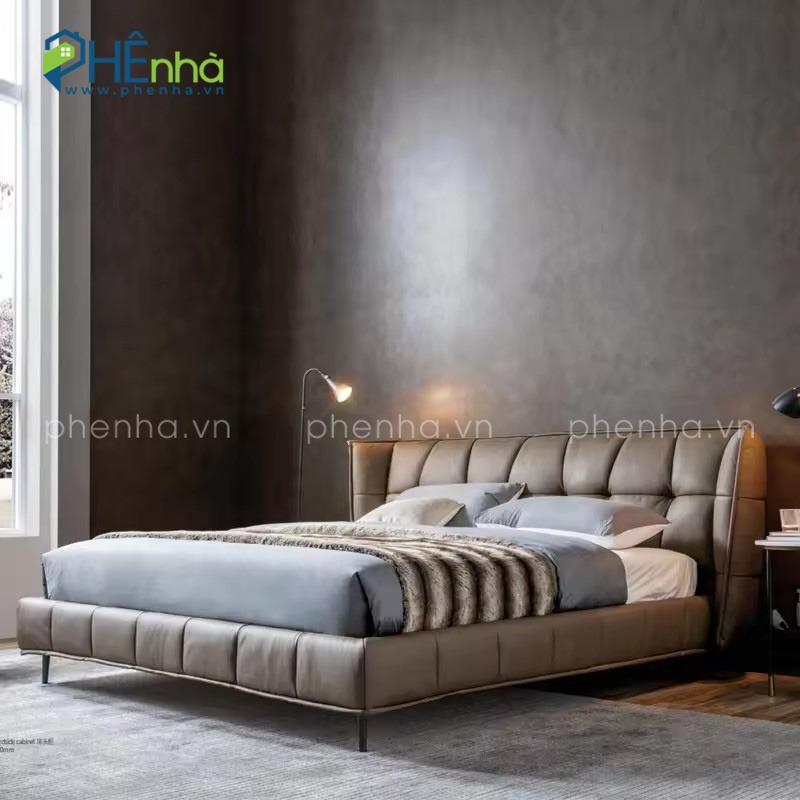 Giường có kiểu dáng đơn giản, hiện đại với đường nét thanh mảnh, gọn gàng. Giường được bọc da thật cao cấp, mang lại cảm giác mềm mại, êm ái và sang trọng