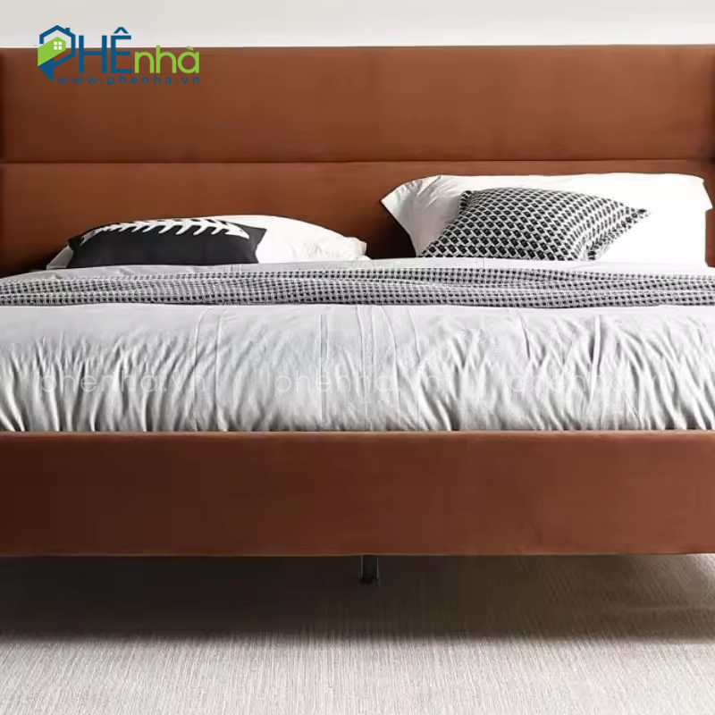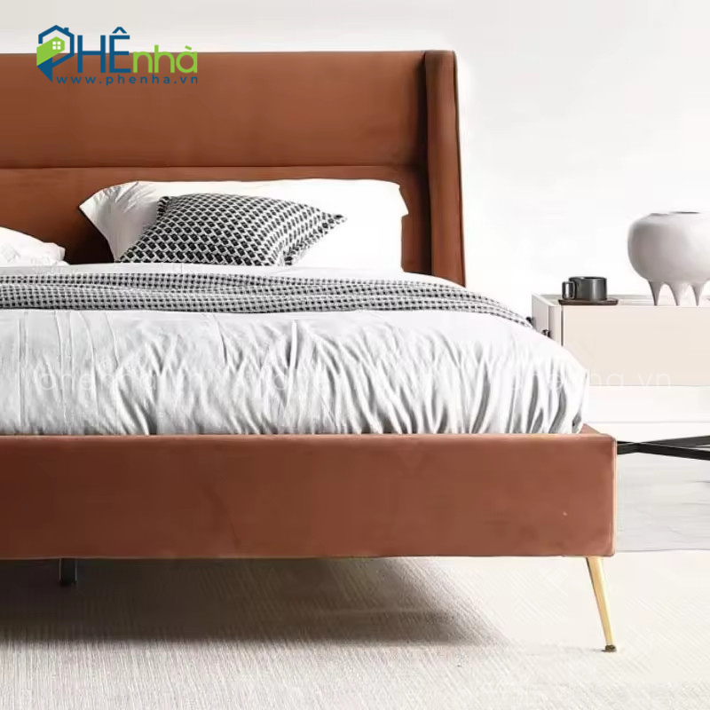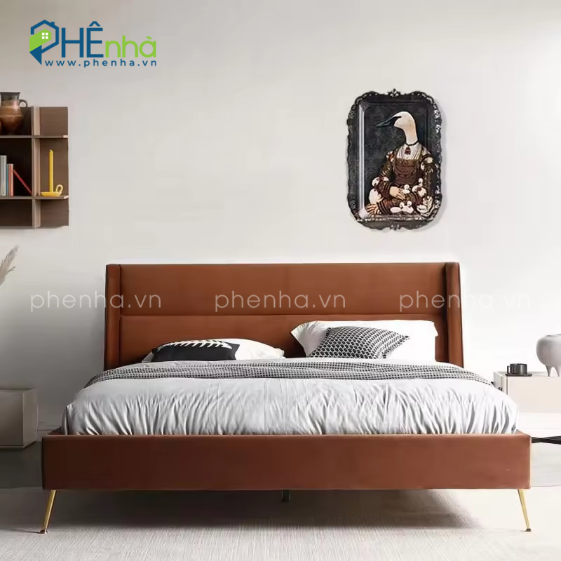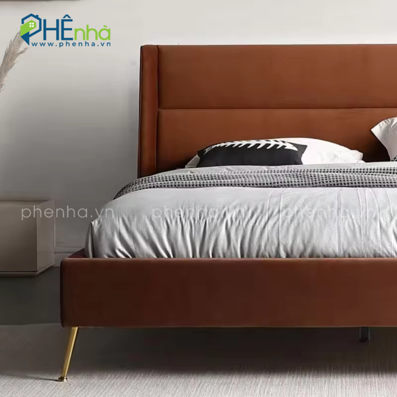 Giường ngủ GN24 được thiết kế vô cùng đơn giản. Sản phẩm được bọc da Hàn Quốc mềm mại, chống thấm nước tốt về dễ dàng vệ sinh. Chưa kể, các mẫu giường bọc da đang trở thành xu hướng nội thất được nhiều gia đình yêu thích nhờ vẻ đẹp sang trọngGiường được bọc da màu nâu sang trọng, mang lại cảm giác ấm áp và thoải máiPhần đầu giường có độ cao vừa phải, giúp người nằm có thể tựa lưng thoải mái khi đọc sách hoặc xem tivi. Phần đầu giường được bọc da màu nâu đồng màu với phần thân giường, tạo sự đồng nhất cho tổng thể chiếc giườngChân giường được làm bằng inox mạ PVD, có độ cao vừa phải, giúp nâng đỡ phần thân giường và tạo sự thông thoáng cho căn phòngChiếc giường ngủ bọc da màu nâu được kết hợp hài hòa với các vật dụng khác trong căn phòng ngủ, tạo nên một không gian ấm áp và sang trọng