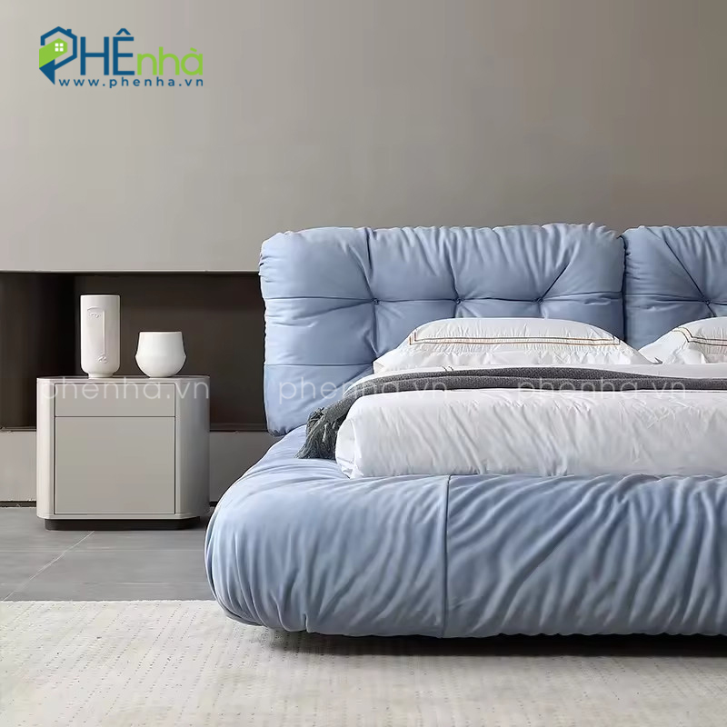 Giường ngủ bọc da nhăn màu xanh có vẻ đẹp trẻ trung và đầy cá tính. Bề mặt da nhăn tạo ra một cảm giác mềm mại và ấm áp, đồng thời tạo điểm nhấn cho không gian