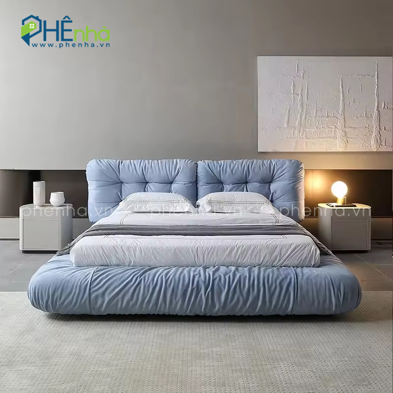 Giường ngủ bọc da nhăn màu xanh trẻ trung – GN16