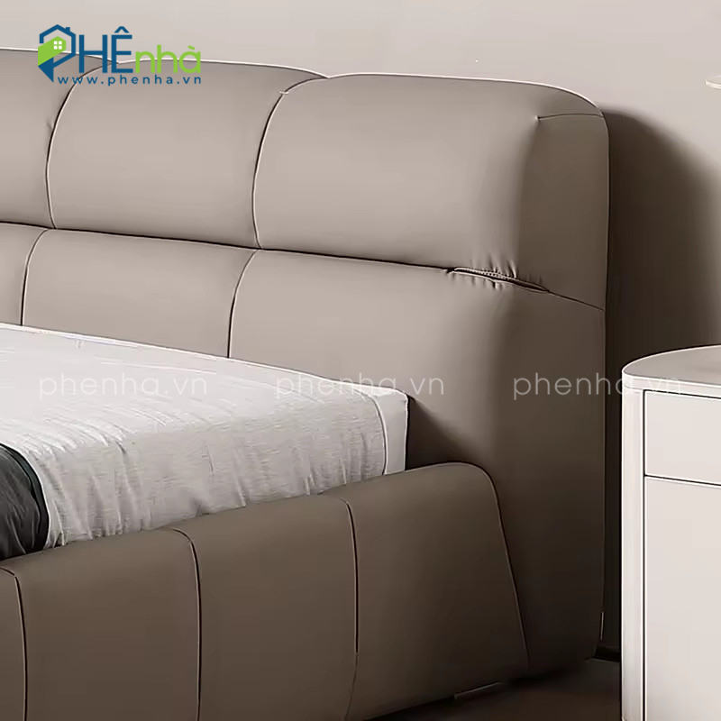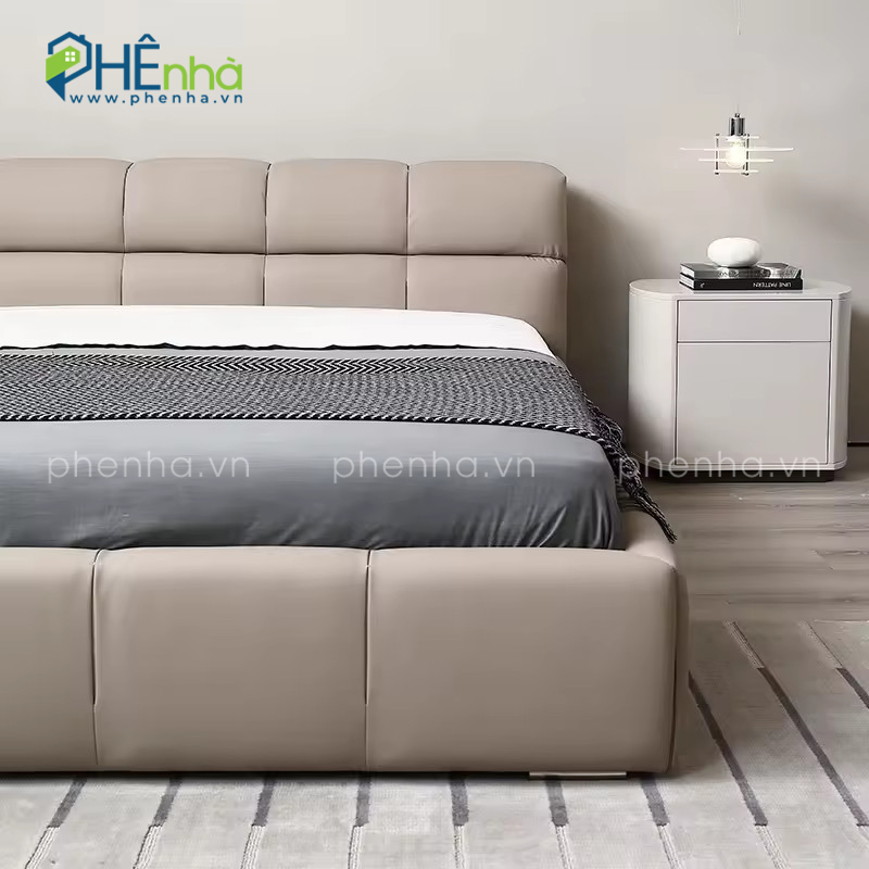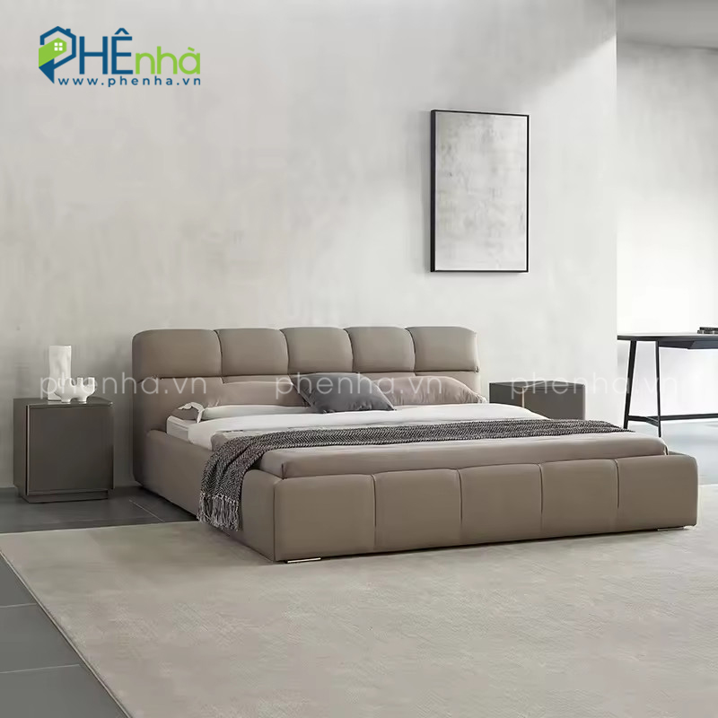 Giường có màu nâu sáng, là một màu sắc trung tính dễ dàng kết hợp với các món đồ nội thất khác trong phòng ngủ