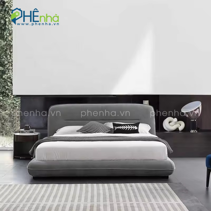 Mẫu giường ngủ bọc nỉ nhung hai màu xám trắng có thể kết hợp hài hòa với nhiều phong cách nội thất khác nhau, từ hiện đại, tối giản đến cổ điển