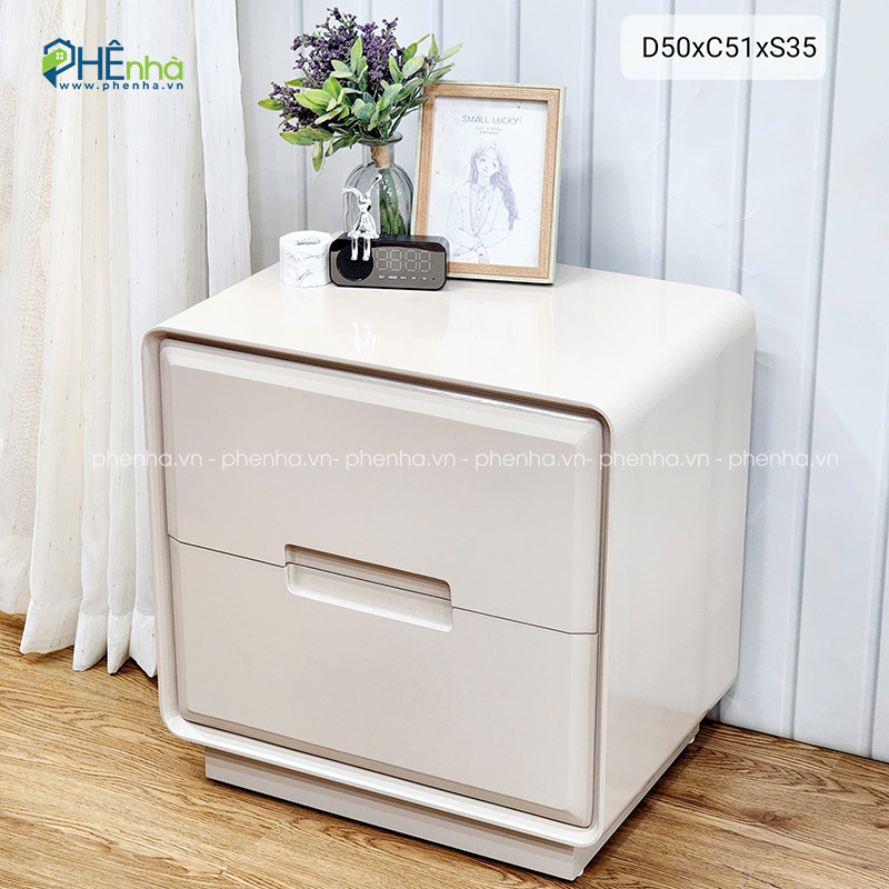 Bên cạnh tủ quần áo hay giường ngủ, tab đầu giường cũng là món đồ nội thất được sử dụng khá phổ biến bởi những tiện ích nó mang lại. Trong đó, không thể không bỏ qua mẫu tab đầu giường gỗ 2 ngăn TG02 – sản phẩm nhận được sự yêu thích của và đánh giá cao của đông đảo khách hàng hiện đang được cung cấp và phân phối bởi Phê Nhà. Nhìn vào sản phẩm này, bạn có thể thấy được thiết kế mang hơi hướng hiện đại, tone màu trắng ngà sang trọng, tinh tế do đó bạn có thể dễ dàng phối hợp với nhiều món đồ nội thất khác nhau. Với thiết kế 2 ngăn kéo tiện lợi, bạn có thể để các vật dụng cá nhân thường xuyên sử dụng như sạc pin, đồng hồ, sách báo, điều khiển… giúp không gian trở nên gọn gàng hơn.
