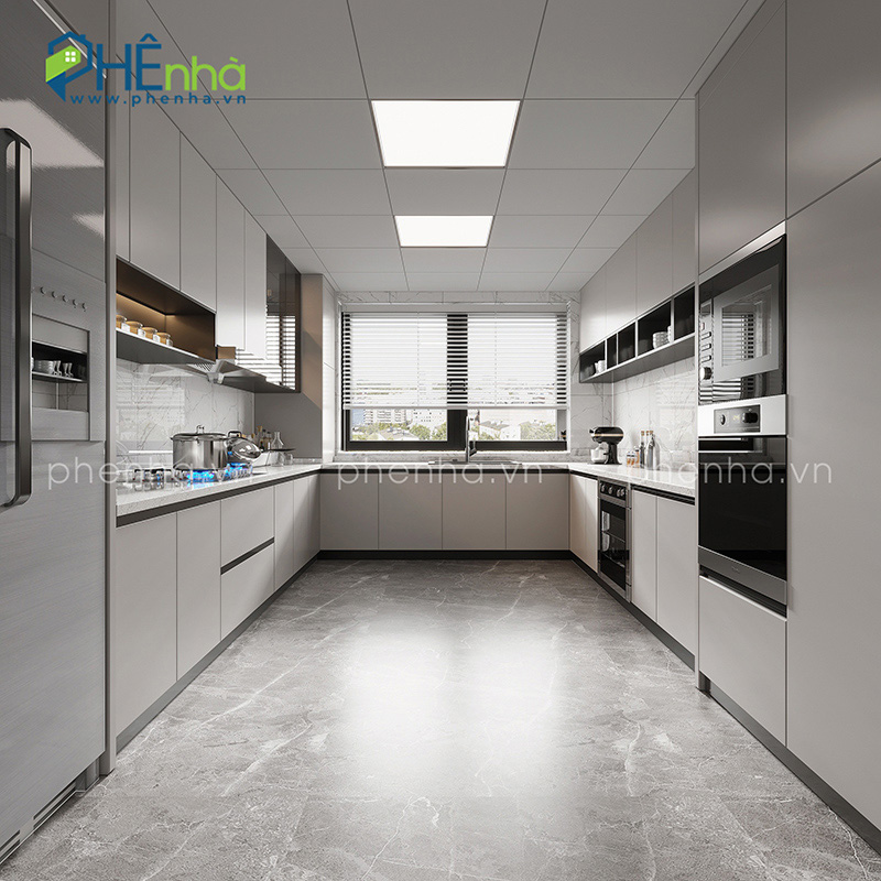 Tủ bếp chữ U với ba cạnh tủ ôm sát ba mặt tường, tạo nên không gian bếp rộng rãi và tiện nghi. Gam màu trắng tinh tế mang đến vẻ đẹp hiện đại, sang trọng cho căn bếp.