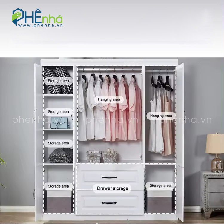 Tủ quần áo có kích thước chiều rộng 160cm x Cao 200cm x Sâu 60cm. Kích thước này phù hợp với nhiều không gian phòng ngủ, từ nhỏ đến lớn