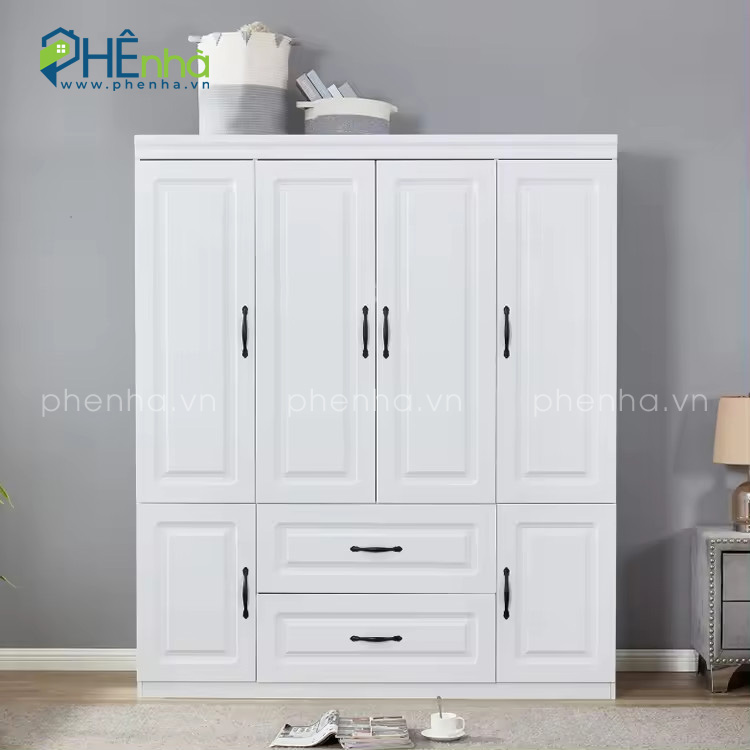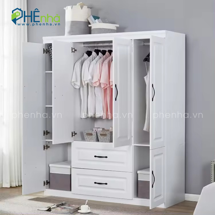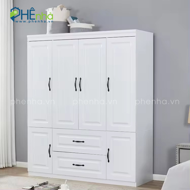 Mẫu tủ quần áo tân cổ điển mở quay 4 cánh gỗ MDF mang vẻ đẹp thanh lịch, thiết kế tiện lợi với nhiều ngăn kéo nhỏ, mở rộng không gian lưu trữ hoàn hảo