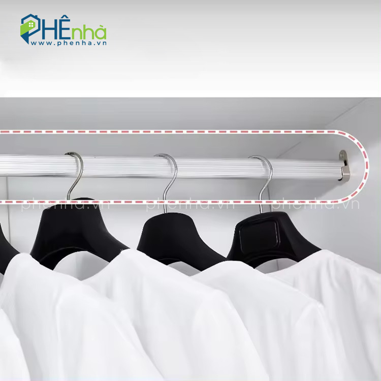 Bên trong tủ đã được lắp sẵn thanh treo quần áo chắc chắn, chịu lực tốt
