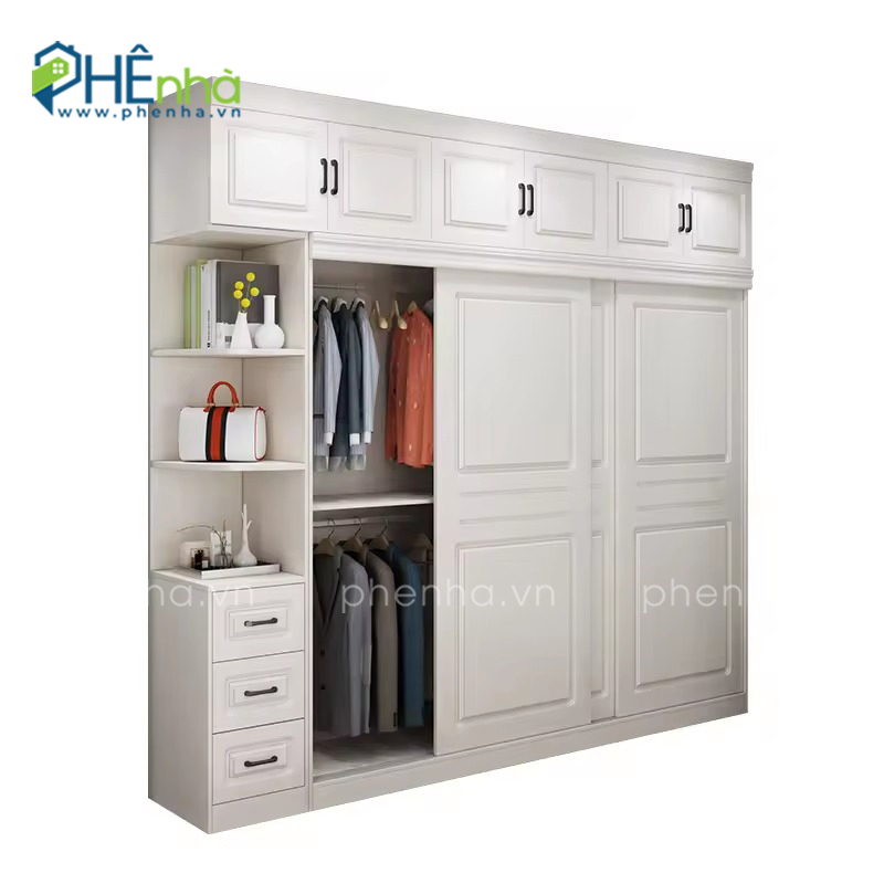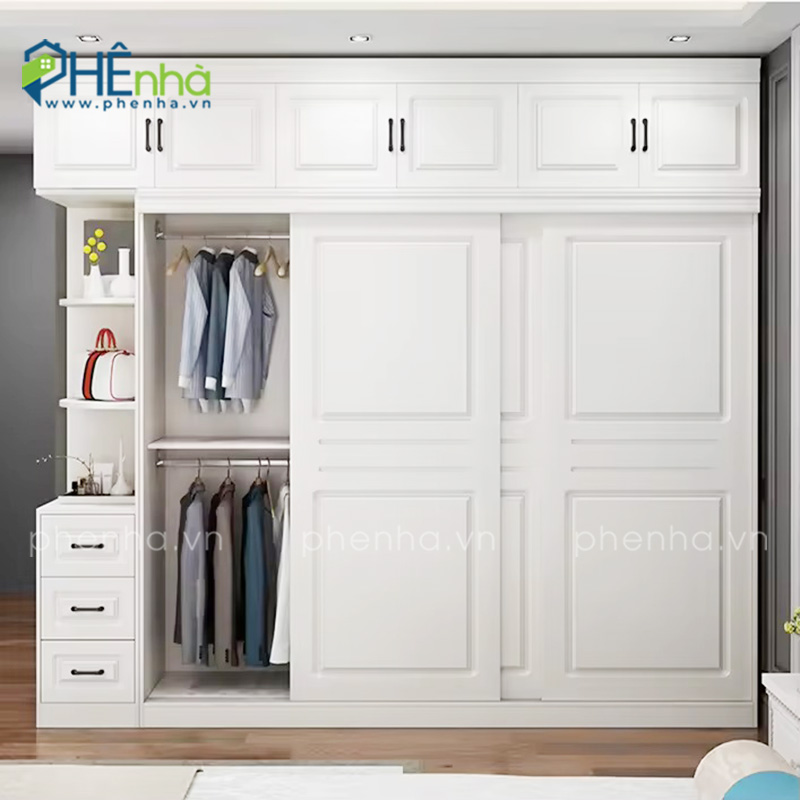 Mẫu tủ quần áo tân cổ điển TA46 có kích thước 240x240x60 cm, được thiết kế kịch trần, toát lên vẻ đẹp sang trọng và đẳng cấp. Sản phẩm bao gồm 6 ngăn tủ nhỏ kịch trần, 3 cánh mở quay, 3 ngăn kéo nhỏ và kệ góc trang trí. Mẫu tủ này sẽ phù hợp nhất với không gian phòng ngủ rộng rãi, không gian mang phong cách tân cổ điển hay những gia đình yêu thích sự sang trọng. Được chế tác từ gỗ MDF chất lượng cao, tủ có thiết kế tinh tế với các chi tiết chạm khắc mềm mại, hòa quyện giữa nét cổ điển và hiện đại. Mặt ngoài của tủ được sơn màu trắng sáng bóng, tạo cảm giác rộng rãi và tươi mới cho phòng ngủ. Cửa trượt của tủ không chỉ giúp tiết kiệm không gian mà còn mang lại sự tiện lợi tối đa trong việc sử dụng. Khi mở ra, bên trong tủ là một không gian rộng rãi với các ngăn kệ được bố trí hợp lý, giúp việc tổ chức quần áo trở nên dễ dàng và thuận tiện. Tủ quần áo tân cổ điển này không chỉ là một món đồ nội thất hữu ích mà còn là điểm nhấn tinh tế cho phong cách thiết kế của căn phòng.